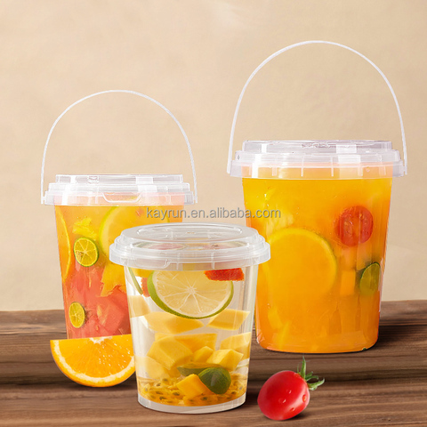 ถังพลาสติก1000มล. พร้อมที่จับและฝาปิดสำหรับน้ำชาน้ำผลไม้นมพิมพ์ลายโลโก้แบบใช้แล้วทิ้ง